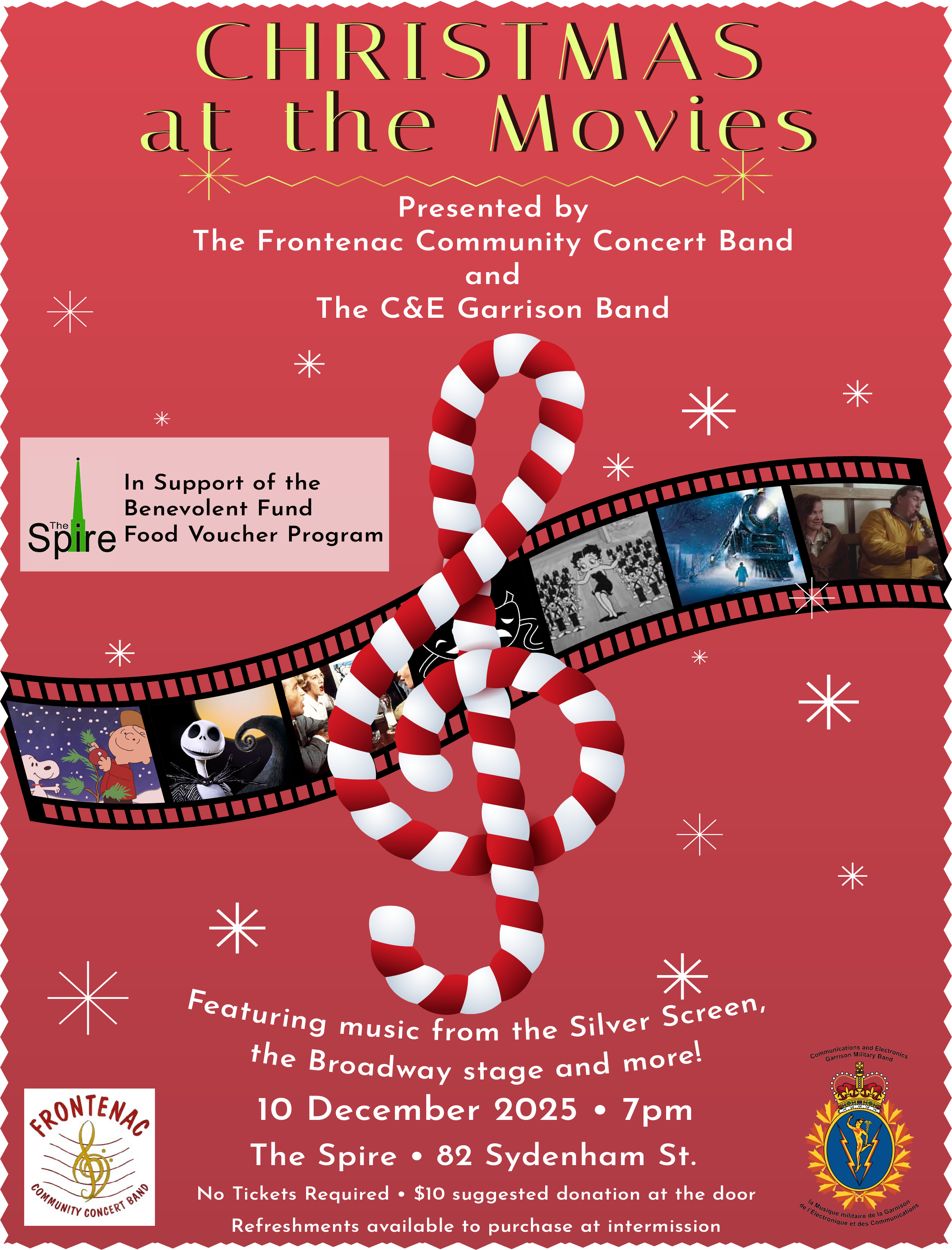 2025 Christmas Concert "Christmas at the Movies" presented by Frontenac Community Concert Band + C&E Garrison Band Wednesday December 10, 2024 7:00pm The Spire 82 Sydenham Street |